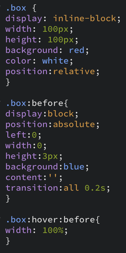 위와 같은 박스에 마우스를 올리면 아래와 같은 파란 선이 왼쪽에서부터 시작하여 0.2초안에 완성되고 싶을 때 어떻게 해야할까?