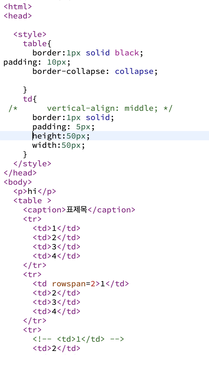 셀 크기 설정을 위해 td{height:50px, width:50px}