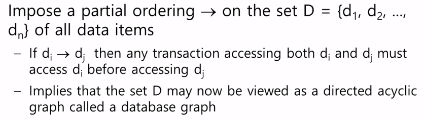 모든 데이터 아이템에 대한 set D이 있다고 하면 접근하는 순서가 partial ordering 을 만족시키면 acyclic한 그래프가 된다. 트리의 인덱스의 경우에는 이런 특정한 상황이 만족된다. 즉, tree-based protocol이 한 예이다.