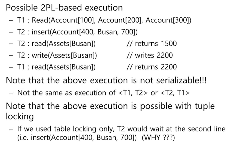 insert가 있어서 2PL을 해도 잘못된 결과가 나온다. 락의 단위를 튜플로 하면 이런 상황이 발생하게 된다. 테이블 단위 락을 사용하면 이 상황을 막을 수 있다. T2가 insert를 하려고 할 때 T1: read-Account를 하고 T1: read-Asset 이후에 언락 페이즈가 진행되기 때문이다. 즉, Account 테이블에 대한 락이 걸려있으므로 insert가 기다리게 된다.