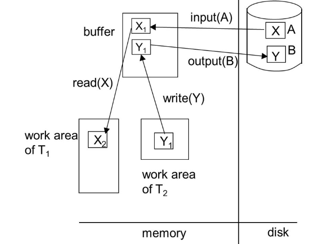 데이터베이스는 disk에 저장되어있고 system buffer가 main memory에 위치한다. 트랜잭션도 ram에 위치하며 read()를 하면 디스크에 x가 있는 페이지를 읽어서 시스템 버퍼로 가져온다. 그 후 트랜잭션이 시스템 버퍼에 있는 x 데이터를 가져온다. 버퍼에 x가 있는 페이지가 있다면 안 가져와도 된다.