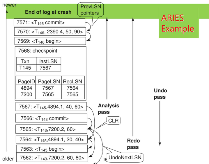end of log에서 failure가 발생했고 ARIES 로 3단계 pass가 진행된다. 2phase와는 다르게 redo pass가 checkpoint 전에서 시작할 수 있고 undo는 undo-list가 없어질 때까지 수행한다.