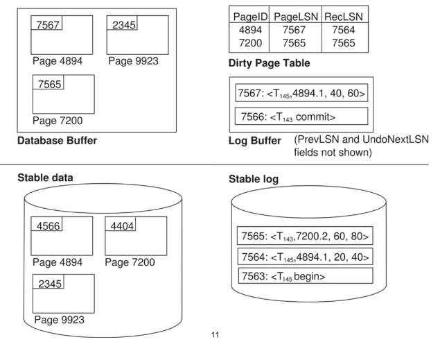 dirty page table에서 page id 4894에 대한 pageLSN과 recLSN이 있다. 7567은 page4894에서 로그레코드 7567까지 반영했다는 뜻이다. 7564는 버퍼가 더티되는 순간에 로그 디비에 남은 로그의 번호이다.