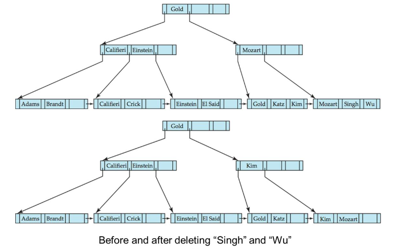 부모 노드의 underflow를 해결하기 위해서 부모노드는 형제와 merge를 하면 된다. 하지만 이렇게 하면 root 노드의 child가 1개가 된다. 따라서 부모노드는 지우고 root를 left child와 merge 한다. 여기서 key값으로 Gold가 사용된다. leaf의 마지막 노드의 최소키인 Katz가 아니어도 child를 구준하므로 현재로서는 B+ tree 기준을 만족한다.