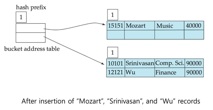 bucket address table이 필요하다. 이 테이블의 크기는 hash function의 prefix에 따라 결정된다.