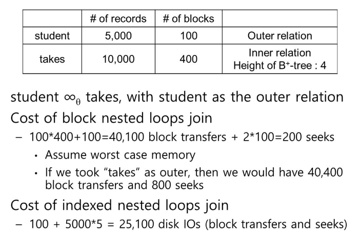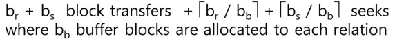 r 튜플 하나를 기준으로 s의 테이블과 비교하기 때문에 r테이블은 br이면 된다. s는 r의 튜플마다 다 가져오므로 nr * bs이다. (ns= n의 튜플 개수, bs = s의 블락 개수)