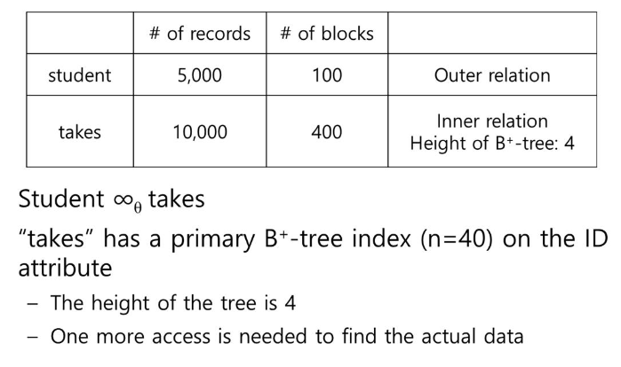 index가 존재하는 경우 r join s를 하면 s를 찾을 때 b+ tree index같은 것을 사용한다.이 때 equi-join이나 natural join만 가능하다.