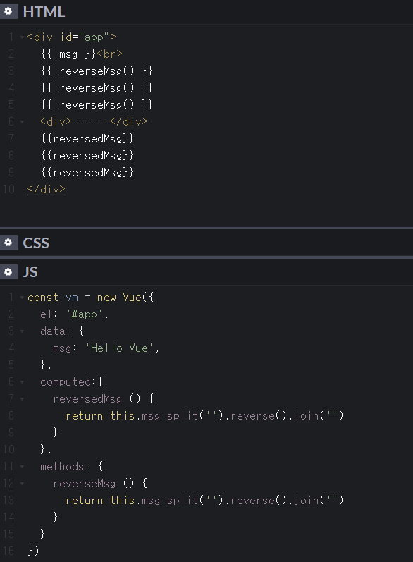 위의 예제에서 methods의 reverseMsg()를 사용하는 것과 computed의 reveresedMsg 를 사용하는 것은 같은 값을 리턴한다.