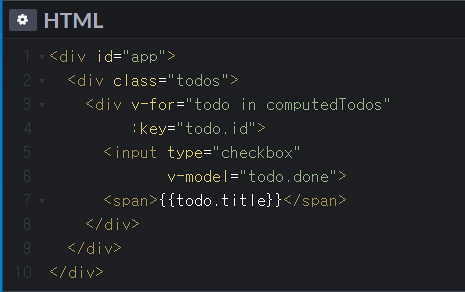 Vue에 있는 computedTodos 배열을 사용하여 하나씩 꺼내서 사용