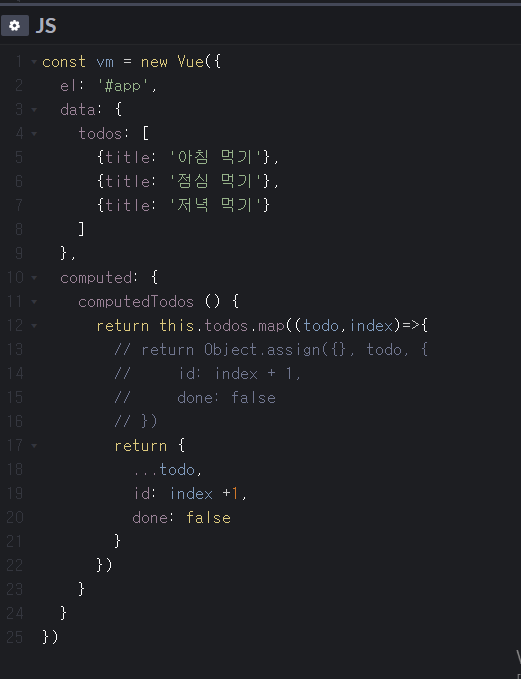 this.todos.map -> todos의 원소 값들 각각에 대해 진행