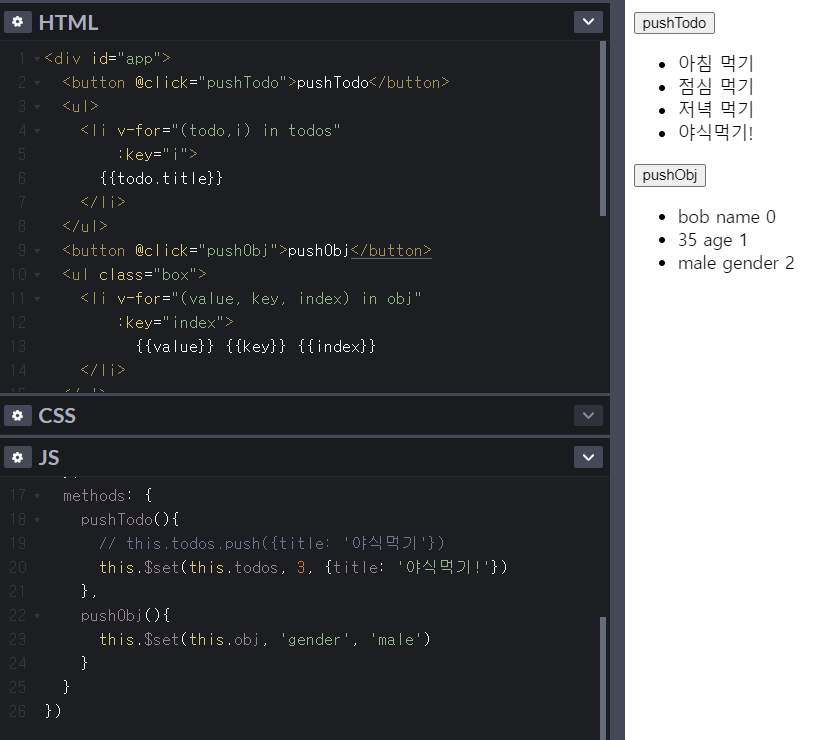 this.todos[3] =new data 이 아니라 this.$set(todos, 3, new data) 를 사용해야 반응성이 생긴다.