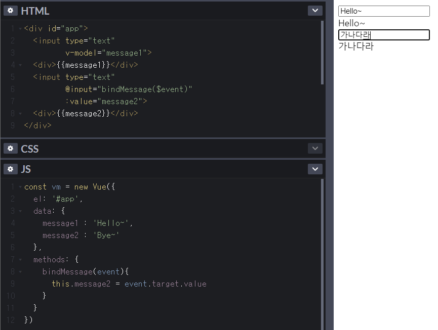 <input @input="핸들러이름" :value="데이터이름">