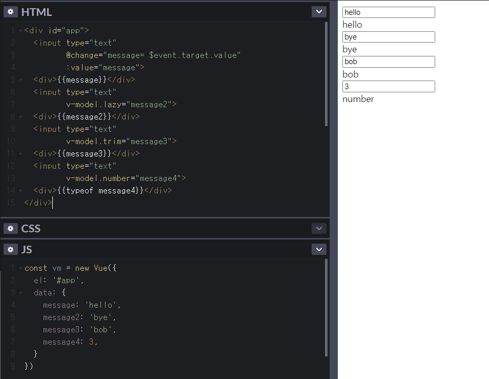아래 코드를 보면서 위의 설명을 확인하도록 하자. v-model은 양방향 바인딩이다.