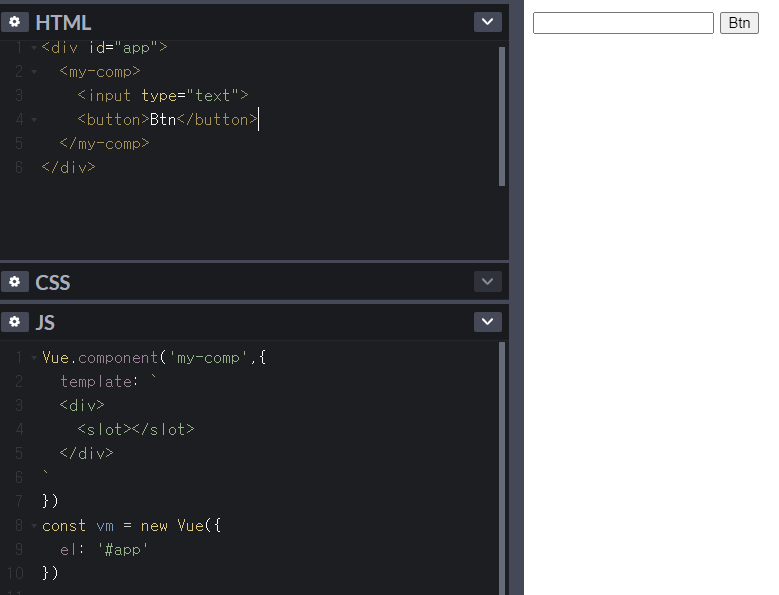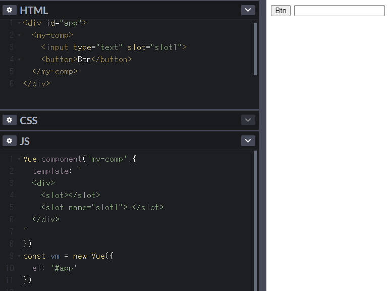 컴포넌트 내용으로 넣을 때 slot의 이름을 지정하는 것도 가능하다. 이러면 Vue의 template에서 원하는 위치에 해당 요소를 위치시킬 수 있다. 다음과 같다. input이 slot1으로 지정되어 실제 화면에서 뒤쪽으로 위치가 변경되었다.