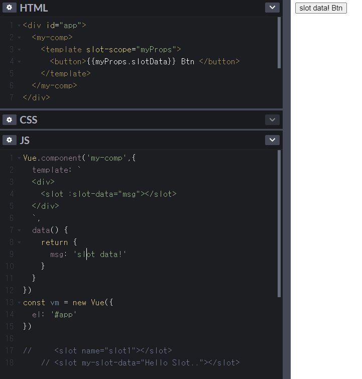 다음과 같이 작성하면 Vue의 데이터를 slot을 만들 때 사용할 수 있다. 다소 복잡하지만 이런 것이 있는 것을 알고있으면 좋을 것이다.