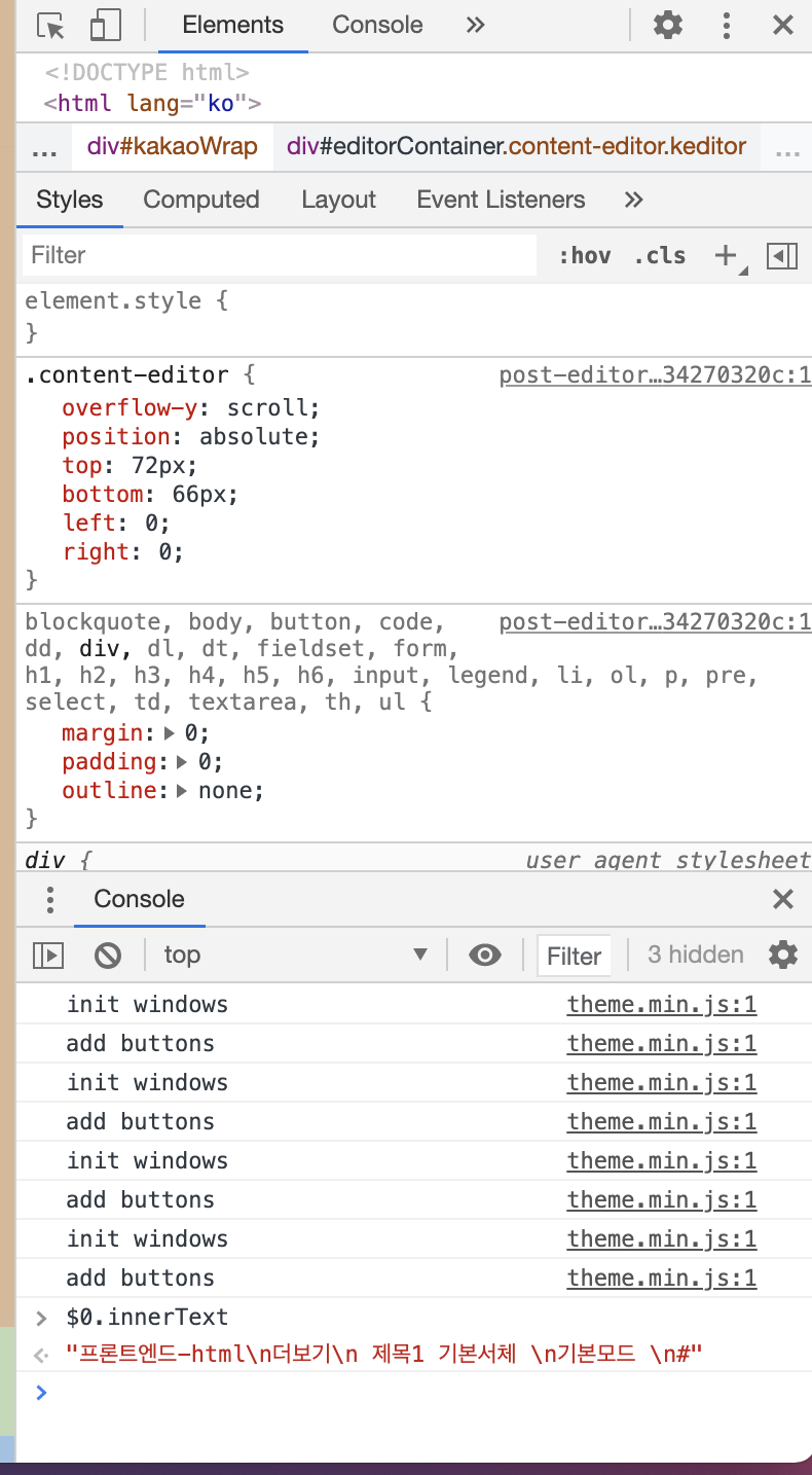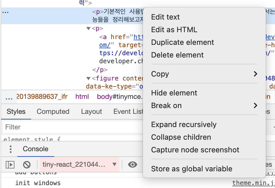 디버거에서 노드가 선택된 상태라면 콘솔에서 $0 키워드를 통해 현재 노드를 접근할 수 있다. $0 키워드 이후 점(.)을 치면 사용가능한 속성이 나오고 $0.innerText 같은 것들을 사용할 수 있다. 콘솔에서 $0까지만 써고 보면 view에서 하이라이트되어서 보인다.