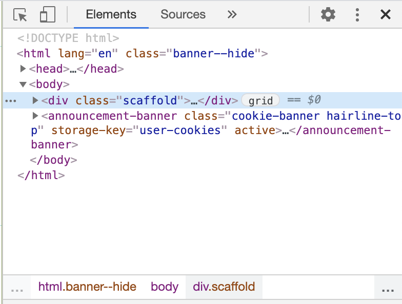 Elements 패널에서 노드를 선택하면 다음과 같이 보인다. 이 중 사진 가장 아래 쪽에 html.banner--hide body div.scffold 부분이 있다.