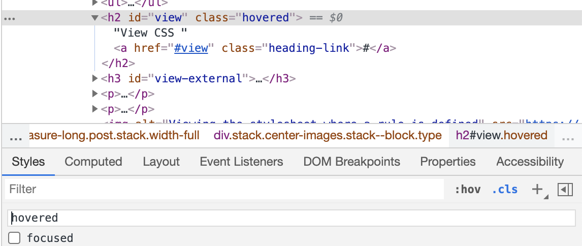 hovered라는 텍스트를 쓰면 현재 선택된 노드에 class="hovered"가 추가된 것을 볼 수 있다.