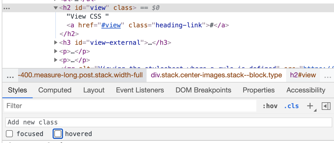 hovered를 쓰고 엔터를 치면 입력하는 란 밑에 hovered가 추가되는데 체크 박스를 통해서 클래스를 붙이는 토글 기능도 제공된다.