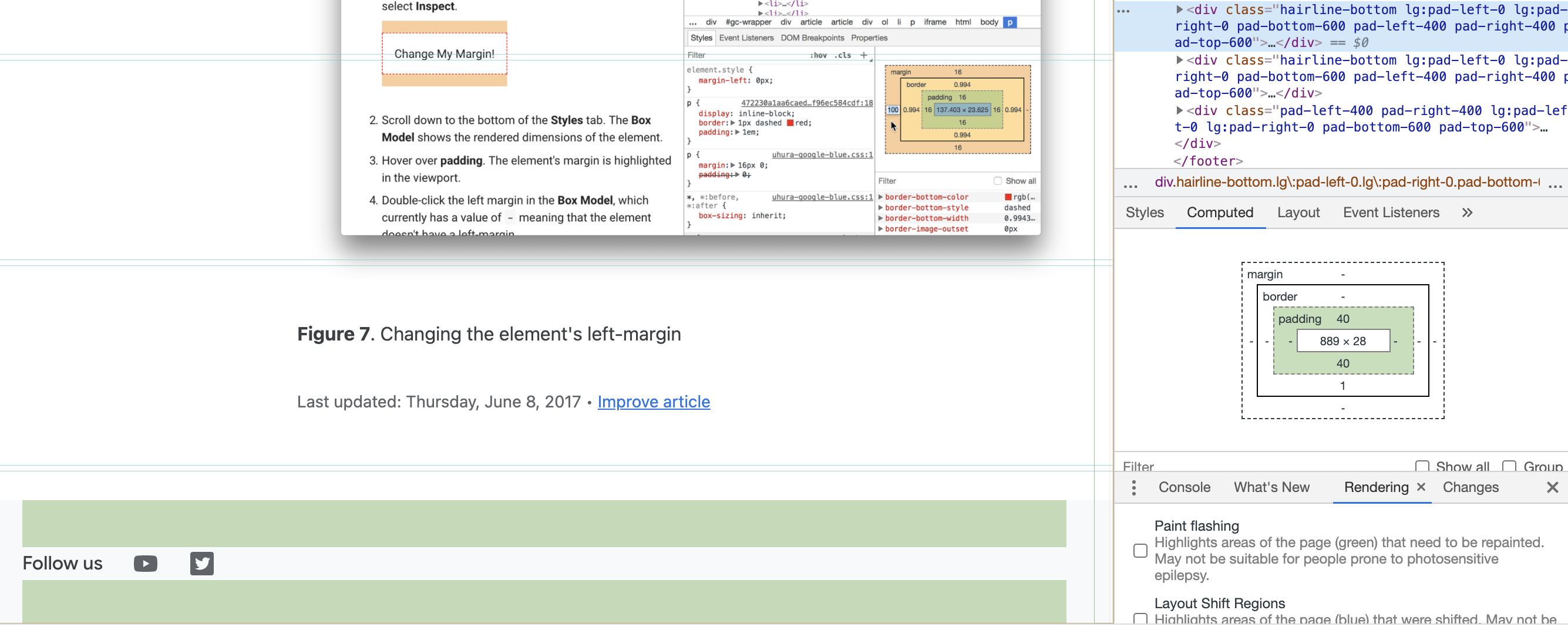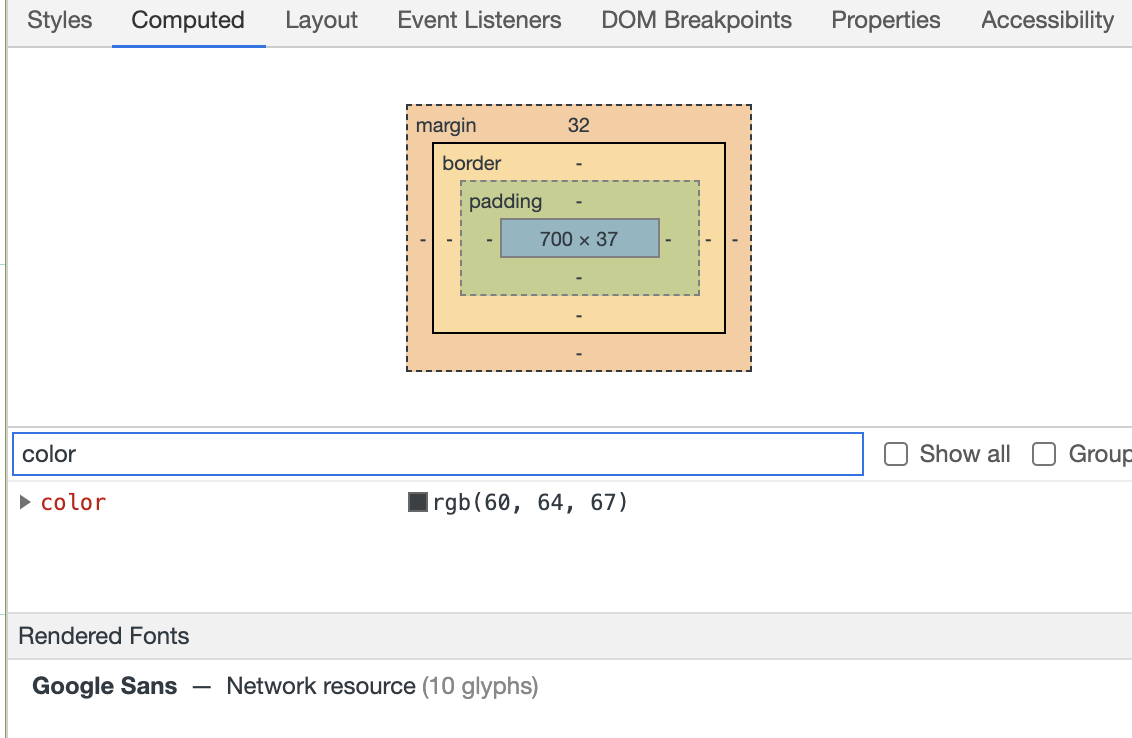 이후 Computed 탭으로 이동하면 다음과 같이 해당 요소의 박스모델을 볼 수 있다. 박스 모델을 바로 수정할 수 있다.