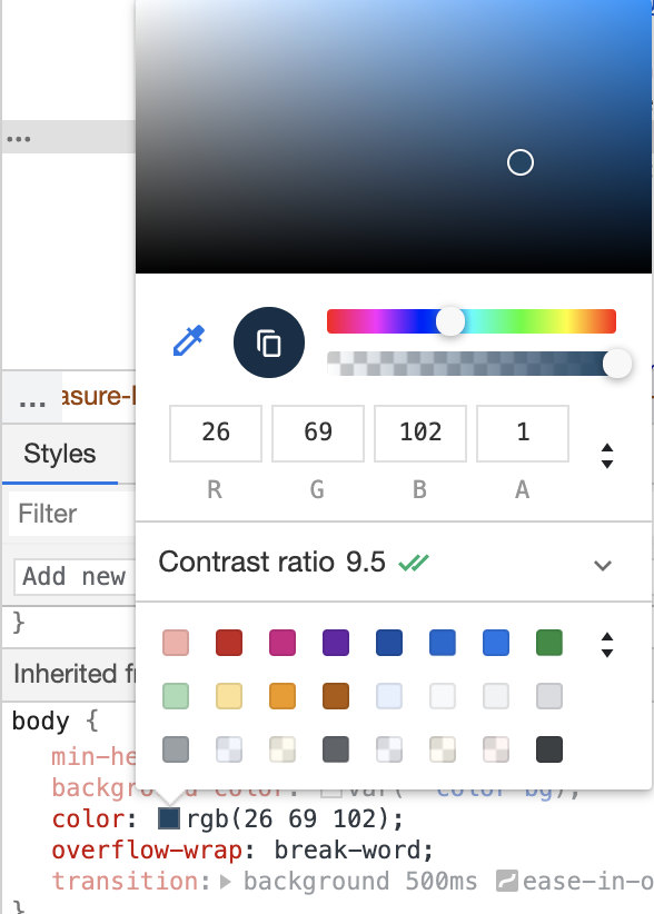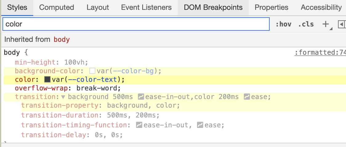 Styles탭에 너무 많은 속성이 나오면 확인하려는 속성을 찾기가 어려울 때가 많다. 이 때 filter를 사용하여 color를 입력하면 하이라이팅을 해주어 쉽게 확인할 수 있다.