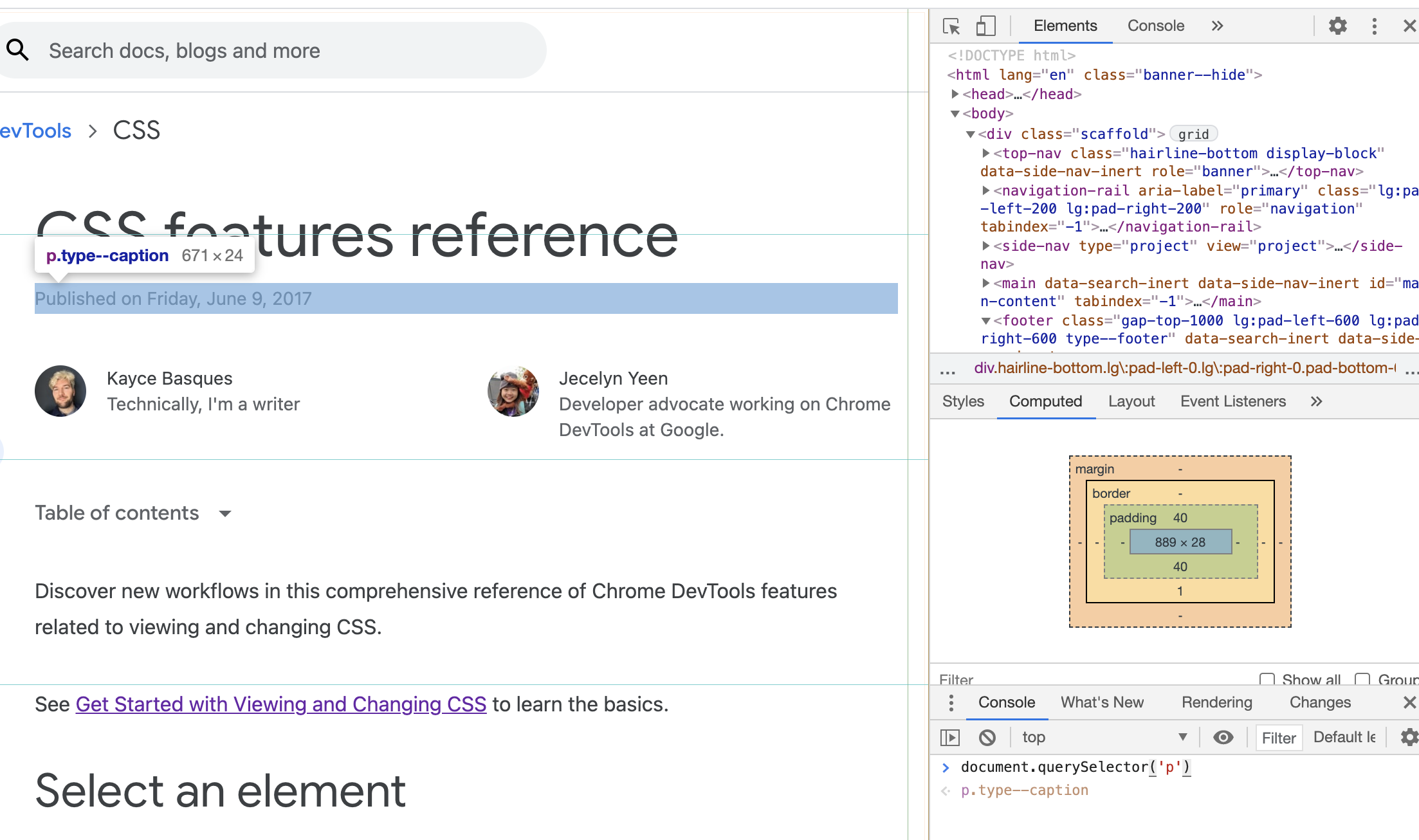 특정 엘리멘트를 document.querySelector()를 이용해서 지정하면 viewport에 표시해준다. 아래 사진에서 document.querySelector('p') 를 쓰면 viewport에 매칭되는 엘리먼트가 하이라이팅된다. querySelectorAll을 하면 2개 이상이 지정되는데 이 때는 하이라이팅이 안되고 document.querySelectorAll('p')[1]과 같이 써주면 하이라이팅 된다.