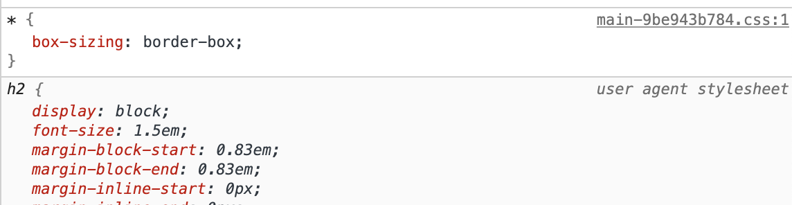 inspector를 사용하면 Styles 탭에 다음과 같은 정보가 나온다. 이 때, 우측에 main-9be943b784.css가 있고 user agent stylesheet가 있다. main-9be943b784.css 파일에서 selector *를 사용하여 box-sizing: border-box를 지정하였고 이것이 선택된 요소에 적용되어 있다는 뜻이다. user agent stylesheet는 현재 사용 중인 브라우저에서 제공하는 스타일인 h2{ display: block, ... } 등이 적용되었다는 뜻이다. 간혹, 브라우저마다 태그에 속성 값을 다르게 하는 경우가 있어서 크로스 브라우징 시에 이슈가 있다면 user agent stylesheet가 다르게 적용되어 있지는 않은지 확인해봐야 한다.