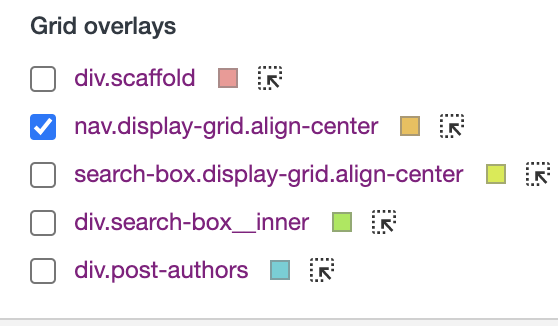 grid나 flex는 복수 선택이 가능하며 엘리멘트 옆에 색상 네모칸은 해당 레이아웃을 viewport에서 하이라이팅 해줄 때 색상이다. 가장 오른쪽에 있는 화살표 버튼을 누르면 viewport에서 엘리먼트가 있는 곳으로 바로 이동이 된다.