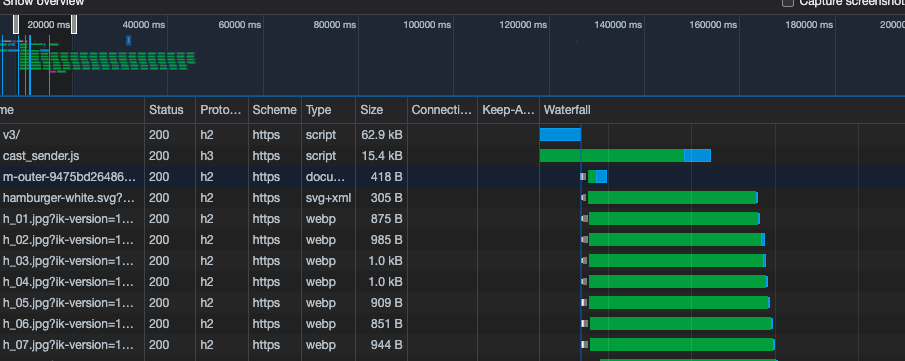 h2를 보면 Wating(TTFB) 가 다 동시에 시작하는 것을 볼 수 있다.
