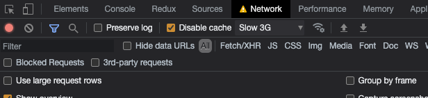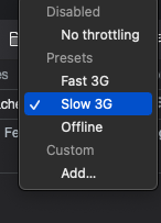 Network 탭을 선택하고 위 사진의 Slow 3G 위치를 누른다. 별도 설정을 안해놨었다면 No throttling으로 되어 있을 것이다.