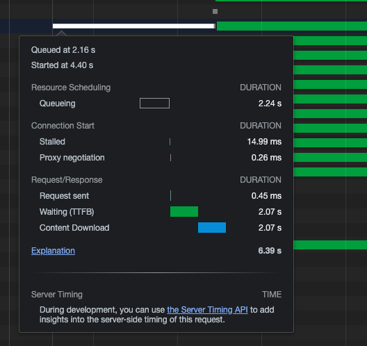 초록색 막대 바 쪽에 마우스를 올리면 다음처럼 표시가 된다. 이 중 Wating(TTFB)는 브라우저가 요청을 보내고 서버에서 첫 바이트를 받을 때까지 기다린 시간이다. 브라우저를 새로고침하고 2.07초가 지나서 해당 요청에 대한 첫 응답 바이트를 받은 것이다.