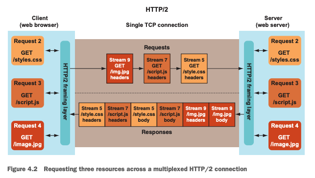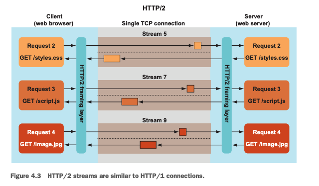 - Multiplexed streams: Requests and responses used a single TCP connection and were broken into interleaved packets grouped into separate streams.
