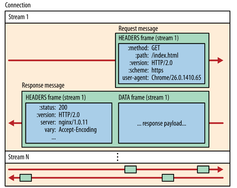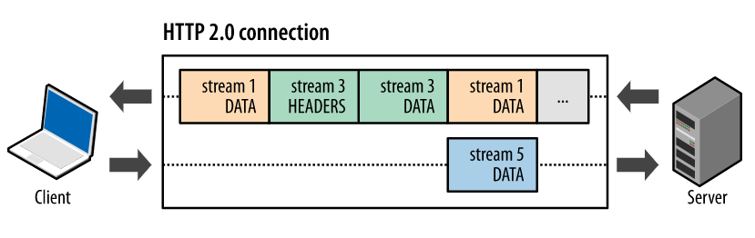 - A single HTTP/2 connection can contain multiple concurrently open streams, with either endpoint interleaving frames from multiple streams.