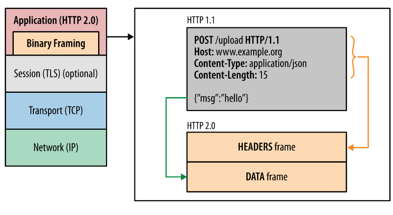 HTTP/2의 모든 성능 향상 중 핵심은 새 바이너리 프레이밍 계층입니다. 이 계층은 HTTP 메시지가 캡슐화되어 클라이언트와 서버 사이에 전송되는 방식을 규정합니다.