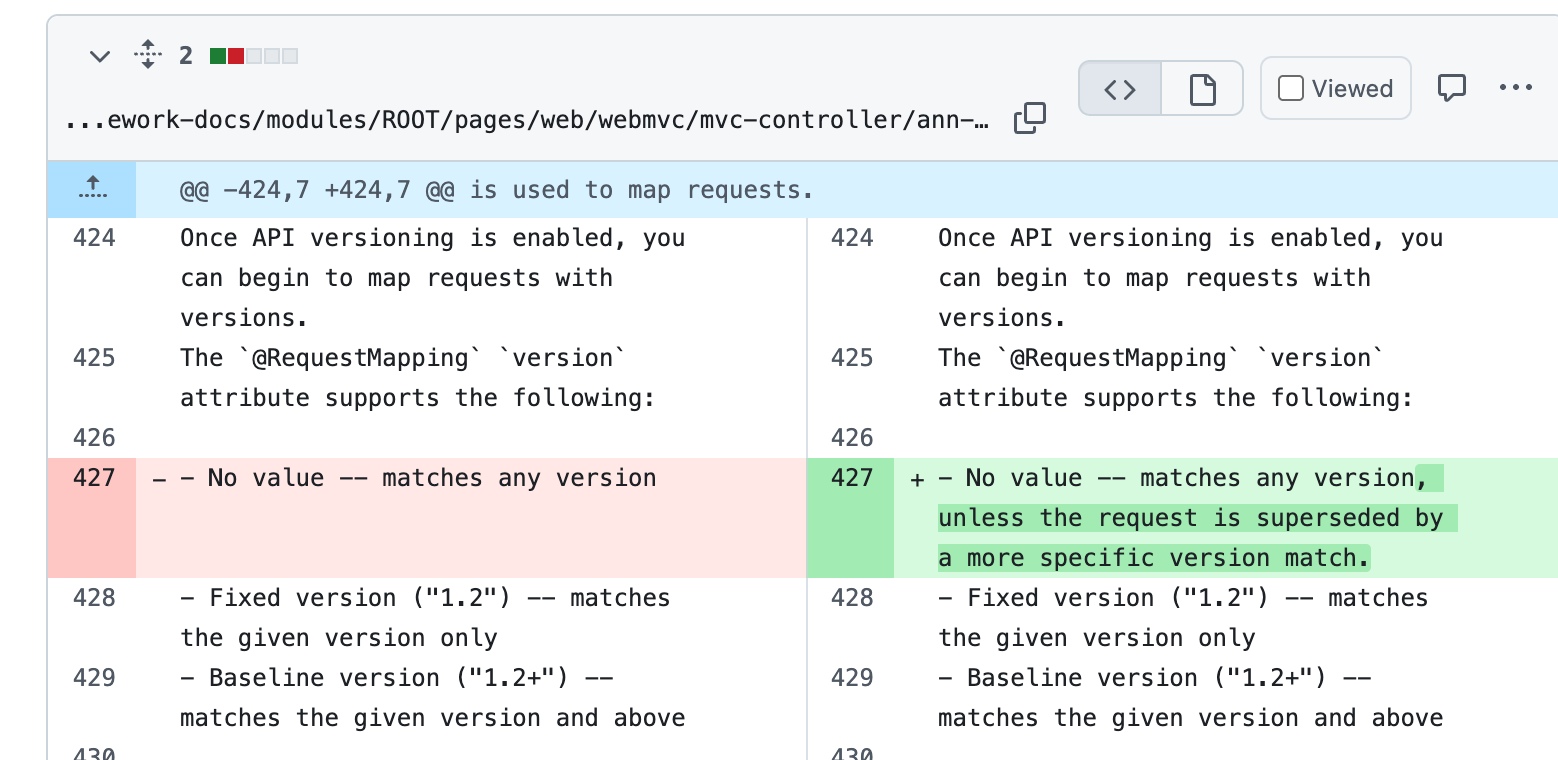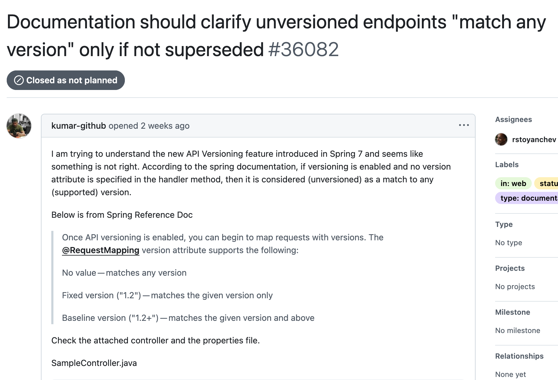 이슈 내용은 스프링 7 부터 api 버전 관련 기능이 생겼는데 "no value인 경우에 대한 문서를 명확하게 해달라"는 의견이었고 메인테이너가 "반영하겠다"고 커멘트를 남겨두었다. 간단히 설명하면, 특정 버전(예: v1.0, v2.0)이 명시된 메서드가 하나라도 생기면, 'No value' 메서드는 그 새로운 버전에 의해 대체 된다. 즉, 더 구체적인 버전이 있다면 'No value'는 선택되지 않는다.(fallback 개념이 아님)