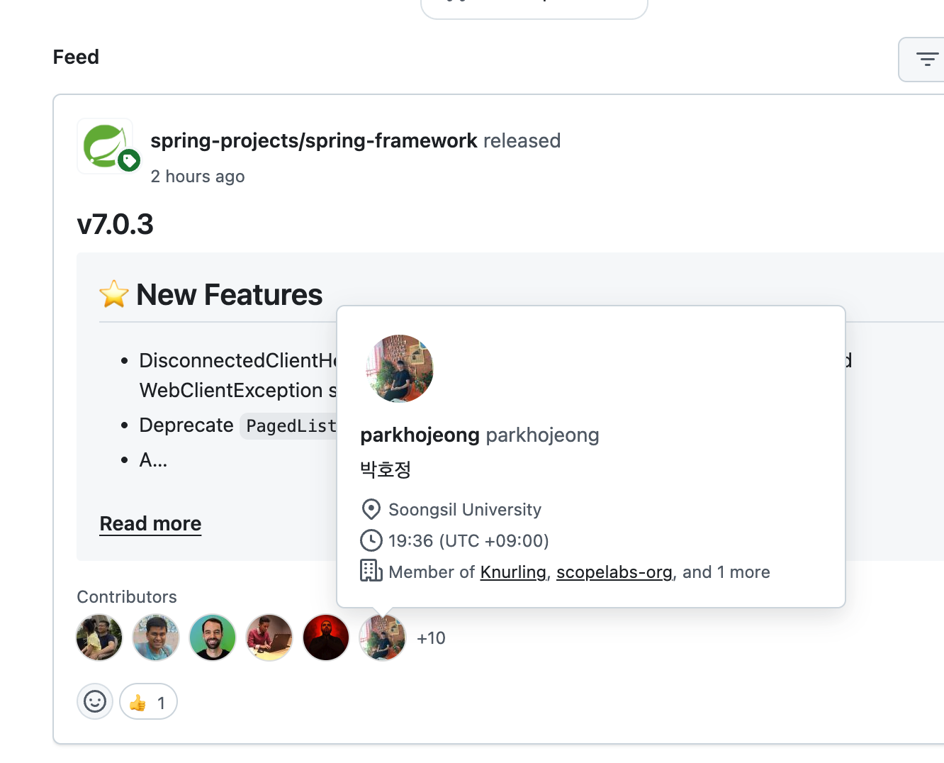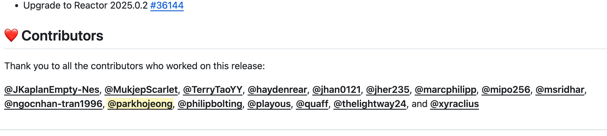 피드에도 운좋게 나오고 릴리즈 노트에 pr과 컨트리뷰터로 멘션되어 있었다.
