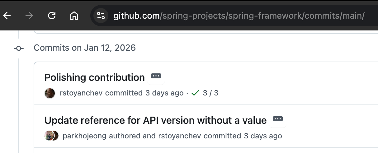 스프링 프레임워크에 3만개 정도 되는 커밋이 있는데, 이 중에 내가 기여한 부분도 있다고 생각하니 뿌듯하기도 하고 앞으로 다른 오픈소스에도 기여해보고 싶다는 생각이 들었다.