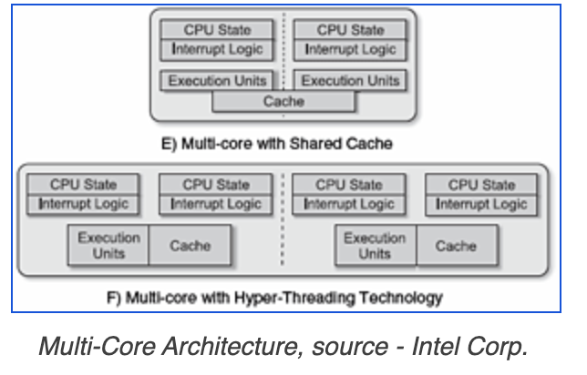 또한 아래 그림의 F) multicore with hyper-threading tech 를 보면 각 코어 별로 cpu state를 별도로 가지고 있다. 이렇게 되면 동일 코어에서 두 개의 쓰레드가 계속해서 스케줄링 되면 context switch가 발생했을 때 사용하는 cpu state만 다른 것을 쓰는 정보만으로 사용할 register 정보를 전환할 수 있다.