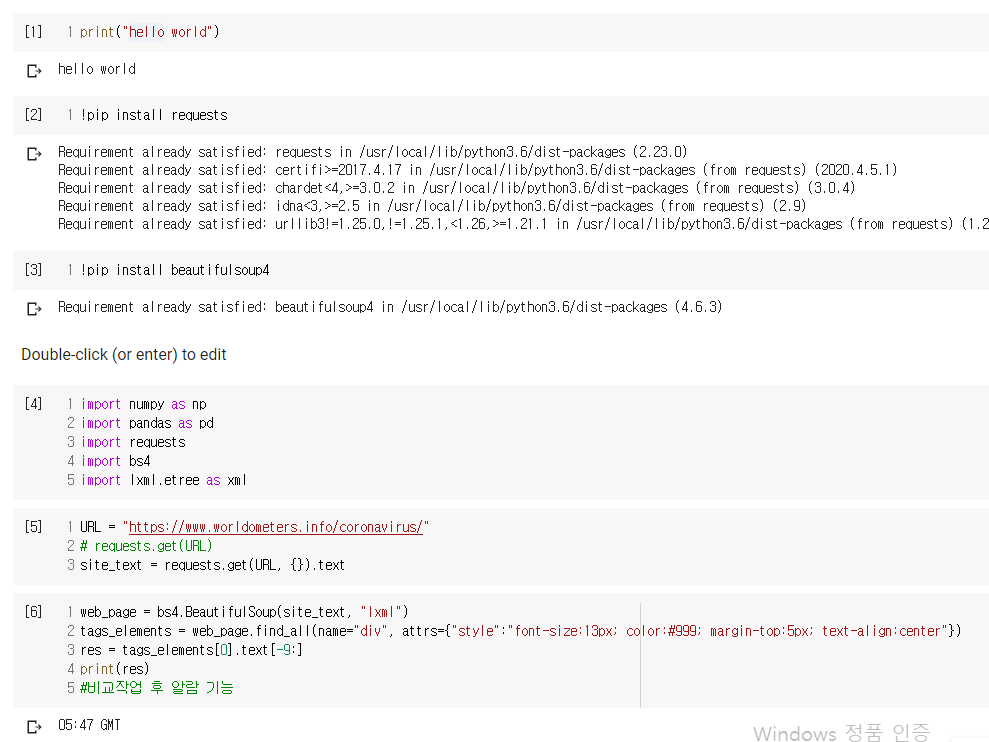 [2], [3]은 라이브러리를 설치하는 과정이다. [4]는 필요한 라이브러리를 임포트하고 [5]에서 사이트의 텍스트를 가져온다. [6]에서 텍스트를 태그와 속성값을 통해서 태그 영역을 가져왔다. 이후 파이썬의 슬라이싱을 통해 시간 정보를 가져온다.